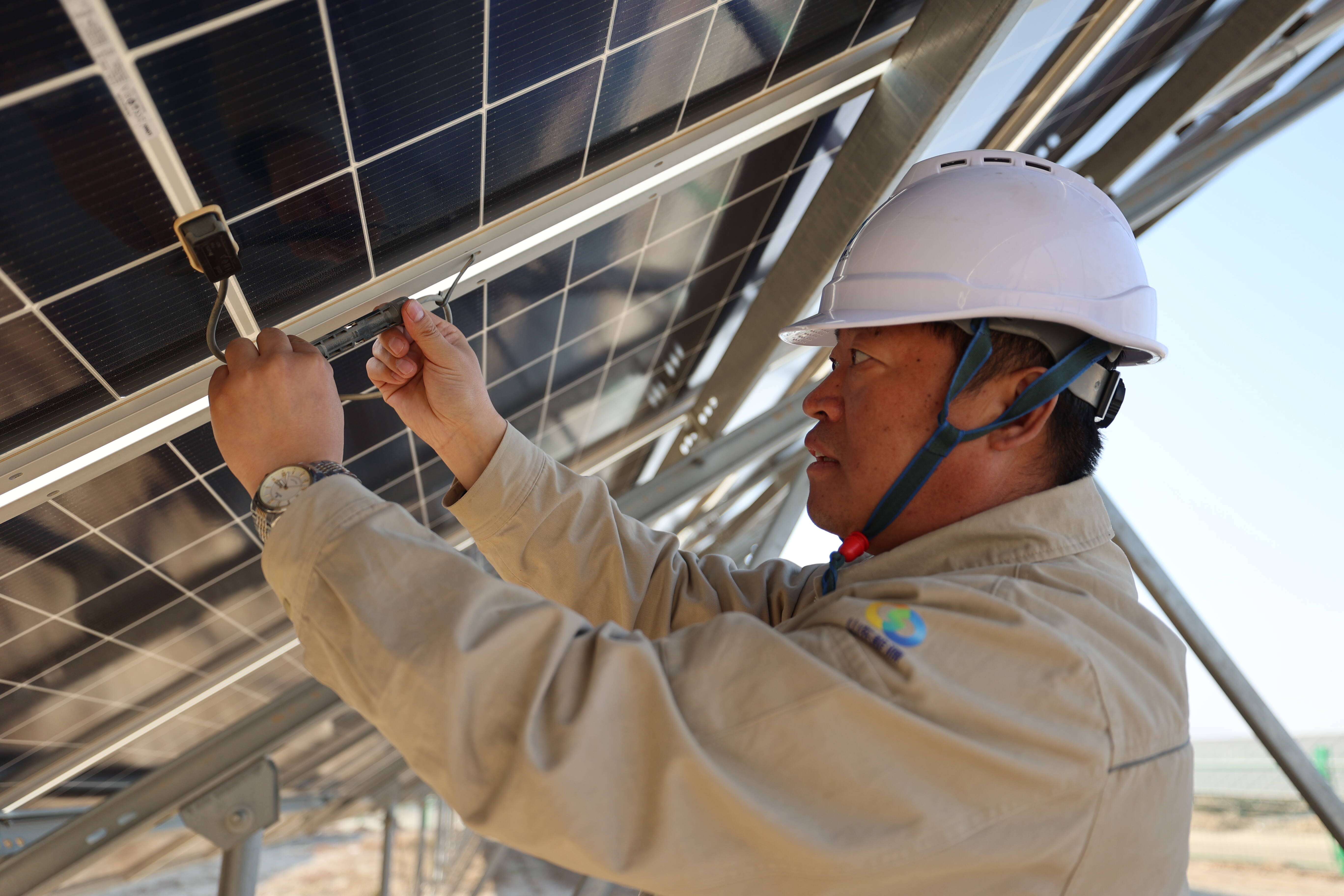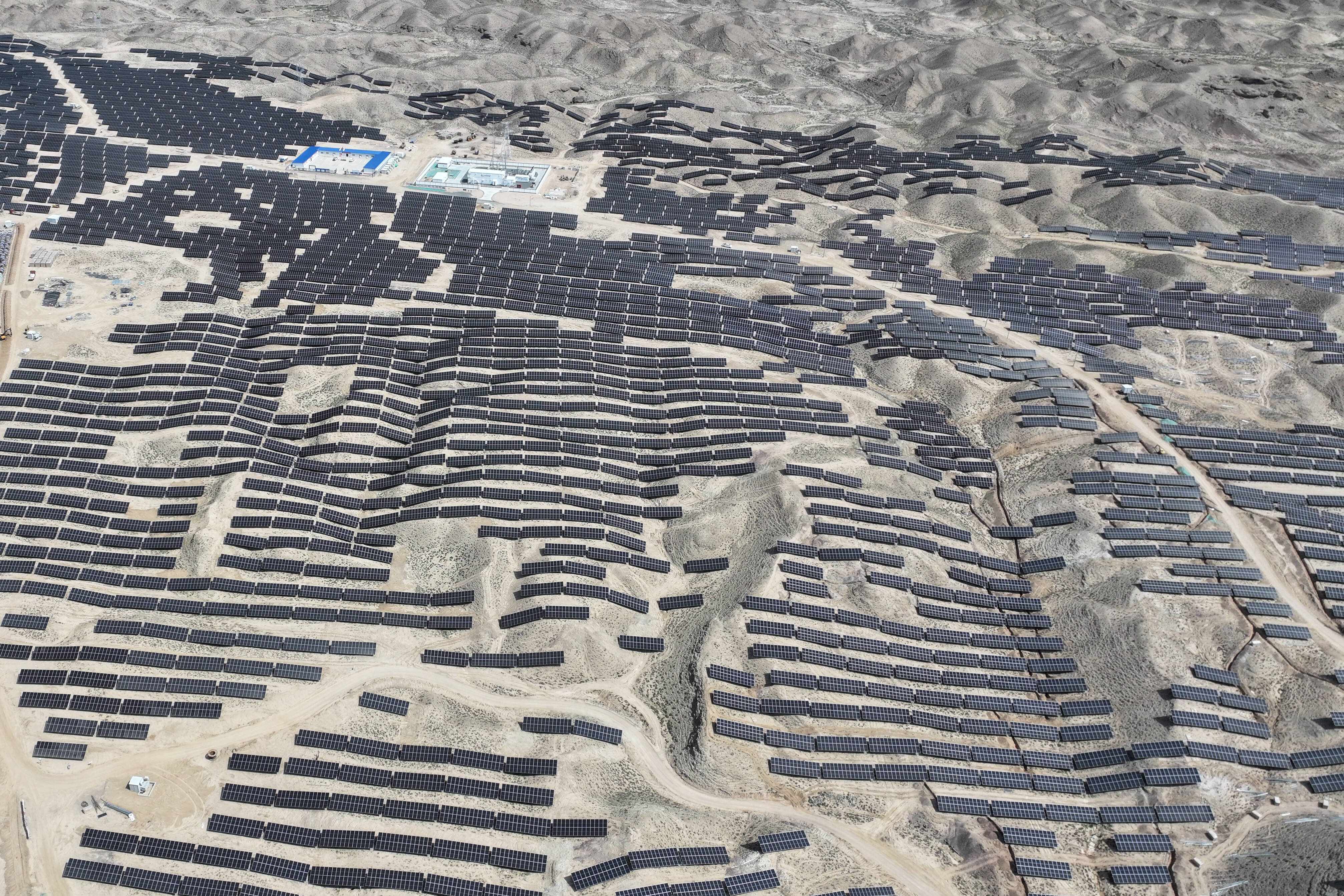 戈壁光伏再扩规模,荒漠披上“蓝色铠甲”。寺滩东15万千瓦光伏项目位于景泰县寺滩乡的黄土塬,总用地面积超5200亩,项目采用615及以上N型组件,安装光伏板超过29万块。面对沟壑纵横、地形起伏的复杂地貌,项目团队通过精准勘测与定制化支架设计,使光伏阵列与地形深度融合,显著提升土地资源利用率。